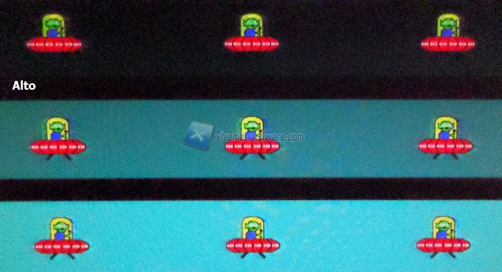 È praticamente inutile mostrare le immagini catturate con la tecnologia Blur Reduction attiva, visto che la riproduzione (in foto) è funzione del valore dell’overdrive selezionato; questo senza poi considerare la difficoltà di riuscire a prendere un frame utile per via della retroilluminazione stroboscopica. Di persona invece l’effetto è maggiormente visibile e come abbiamo già detto anche in altre occasioni, ne migliora decisamente la definizione (riducendo appunto la sfocatura). Confrontando il comportamento del monitor con ad esempio l’EIZO FG2421 e l’ASUS PG278Q (altri due modelli con funzione simile), il BenQ va ad occupare la terza posizione e magari più per un overdrive che avrebbe potuto essere regolato in modo più accurato. Nel test ufo, è la modalità Disattiva che restituisce una visione tendenzialmente migliore. Seppure in foto non si riesce a cogliere il dettaglio perfetto, gli altri setting più spinti (Alto e Premium) inducono un fantasma scuro davanti, mantenendo comunque il classico ghost posteriore. Dai test risulta quindi maggiormente convincente la configurazione Blur Reduction attiva con l’impostazione AMA su Disattivato.