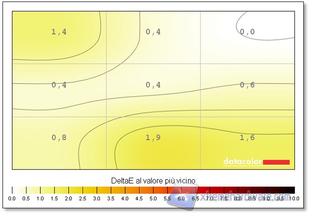 Suddividendo lo schermo in nove rettangoli, abbiamo misurato con il colorimetro l’uniformità della luminosità e dei colori. La differenza massima registrata è risultata pari al 15%, con una media del 6,4%, per quanto riguarda la luminosità, mentre per il colore, il Delta-E maggiore è stato di 1,9, con una media dello 0,8.