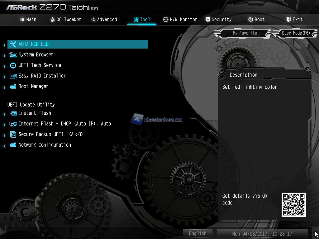 Passiamo ora a ‘’Tool’’ una ‘’collezione’’ di funzioni utili a segnalare errori ad ASRock direttamente dal BIOS previa connessione ad Internet, o ancora aggiornare il BIOS da Internet, scaricare i driver relativi al sistema operativo che abbiamo installato o ancora creare in modo sicuro e veloce un RAID. Alcune voci come la segnalazione di errori e l’aggiornamento del BIOS direttamente dal BIOS stesso sono esclusive di ASRock. Troviamo anche, come vi accennavamo, il pannello AURA RGB LED, replica esatta del software per Windows, con cui potremo gestire l’illuminazione RGB direttamente da BIOS.