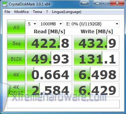 CrystalDiskMark è un utilissimo software per misurare le performance in lettura e in scrittura in modo sequenziale (sequential) e casuale (random), grazie al pieno supporto del NCQ (Native Command Queuing) l'ordine degli IOPS viene ottimizzato in modo da migliorare le prestazioni di input/output con una Queue Depth (file in coda) di 32, tale test consente di osservare il comportamento del drive durante il trasferimento di numerosi file con dimensioni ridotte.