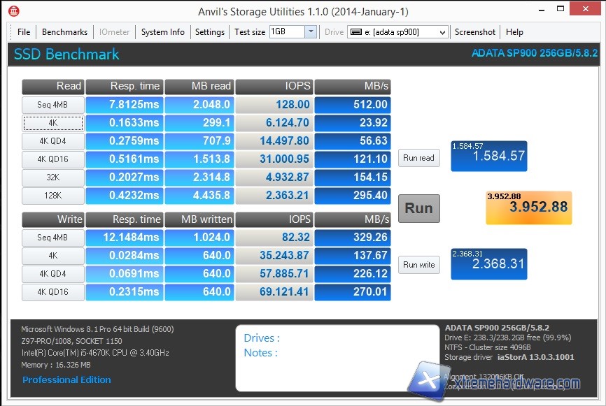 A seguire i grafici con i valori ottenuti dall'ADATA SP900 da 256GB.