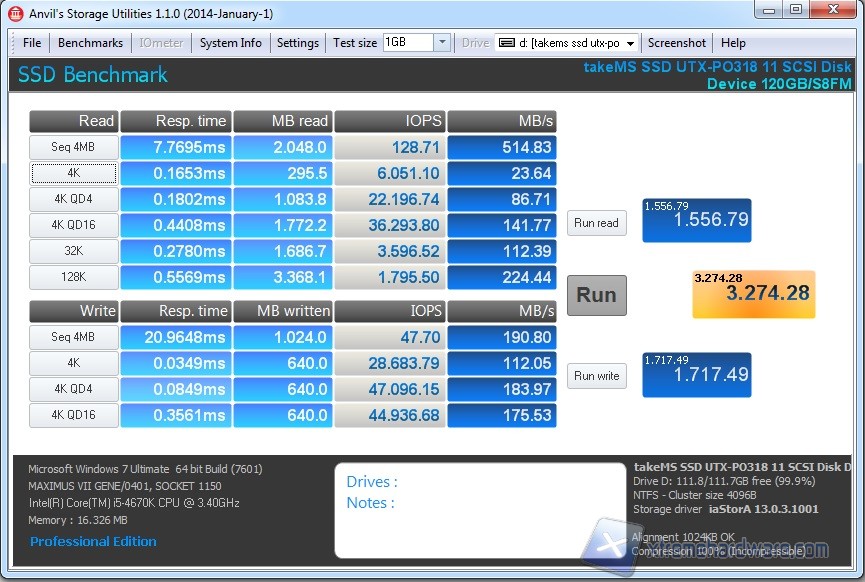 Questo nuovo bench introdotto nella nostra suite di test, chiamato Anvil's Storage Utilities, è pensato appositamente per gli SSD ed è in grado di testare i drive sotto ogni aspetto. I risultati ottenuti sono sempre molto elevati. Con lo stesso Benchmark abbiamo provveduto ad effettuare i test occupando parte del drive, è interessante notare come lo score non differisce di molto da quello ottenuto ad SSD vuoto.